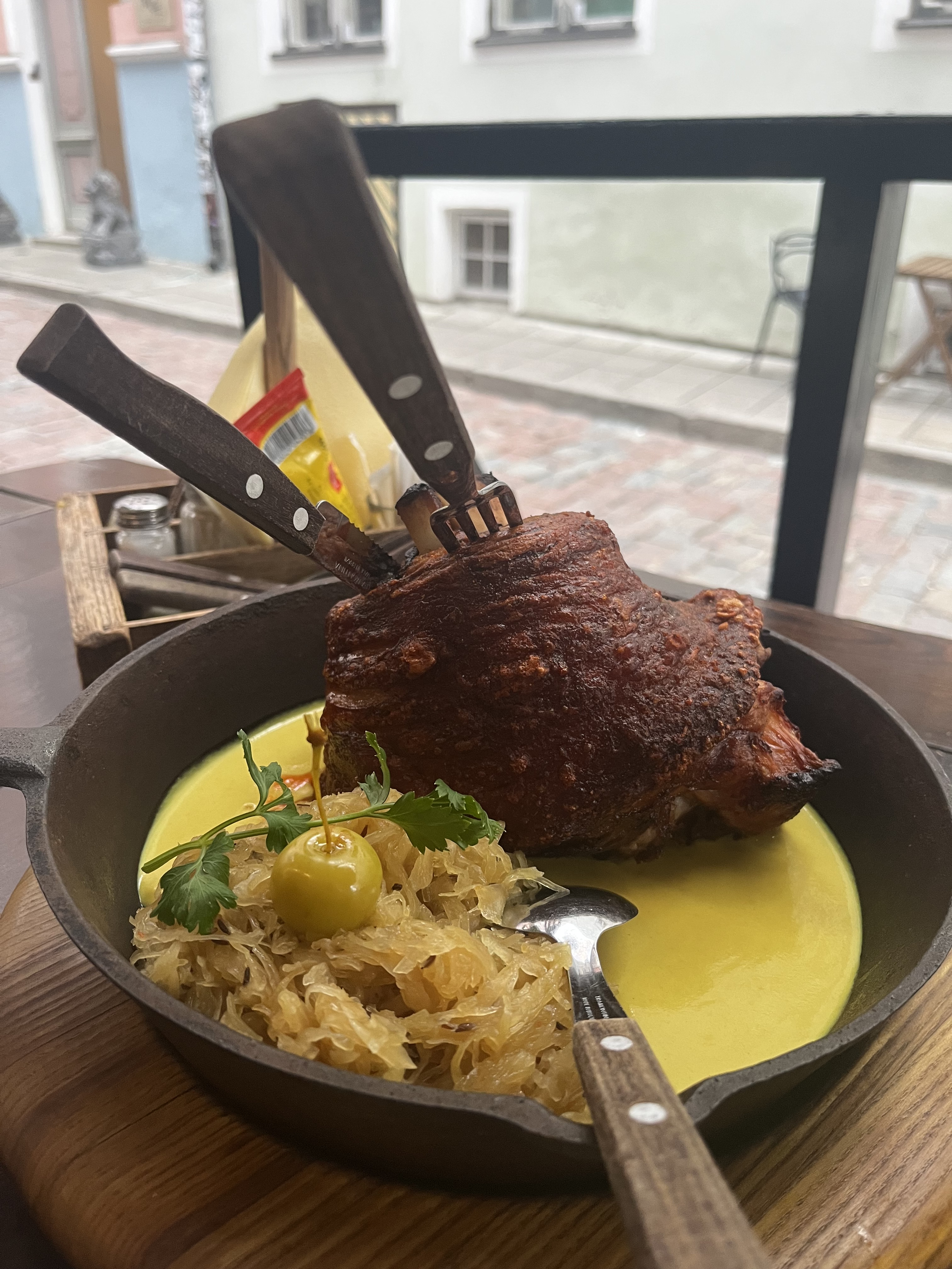 We went in search of food and found a place I had read about just off Town Hall Square. Beer House, a German restaurant and brewery, offers seven house brews along with a lengthy menu of German snacks and fare. We found a spot on their terrace, ordered two of their brews, and indulged in the spread of black bread and butter brought to the table. We ordered a crispy pork shank to share and were delighted when it arrived still on the bone, soaking in a honey mustard bath with sauerkraut on the side. It was delectable, juicy and moist with wonderfully crunchy skin.