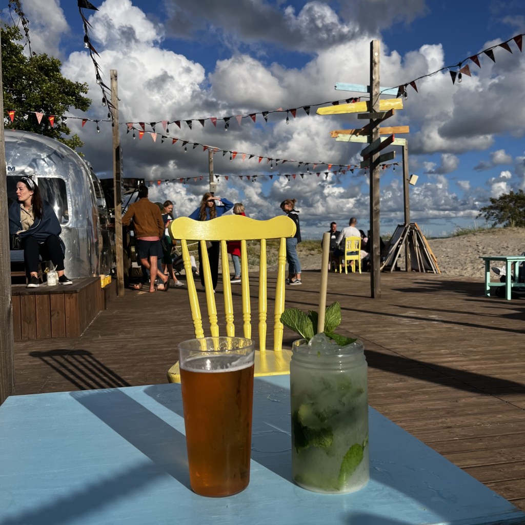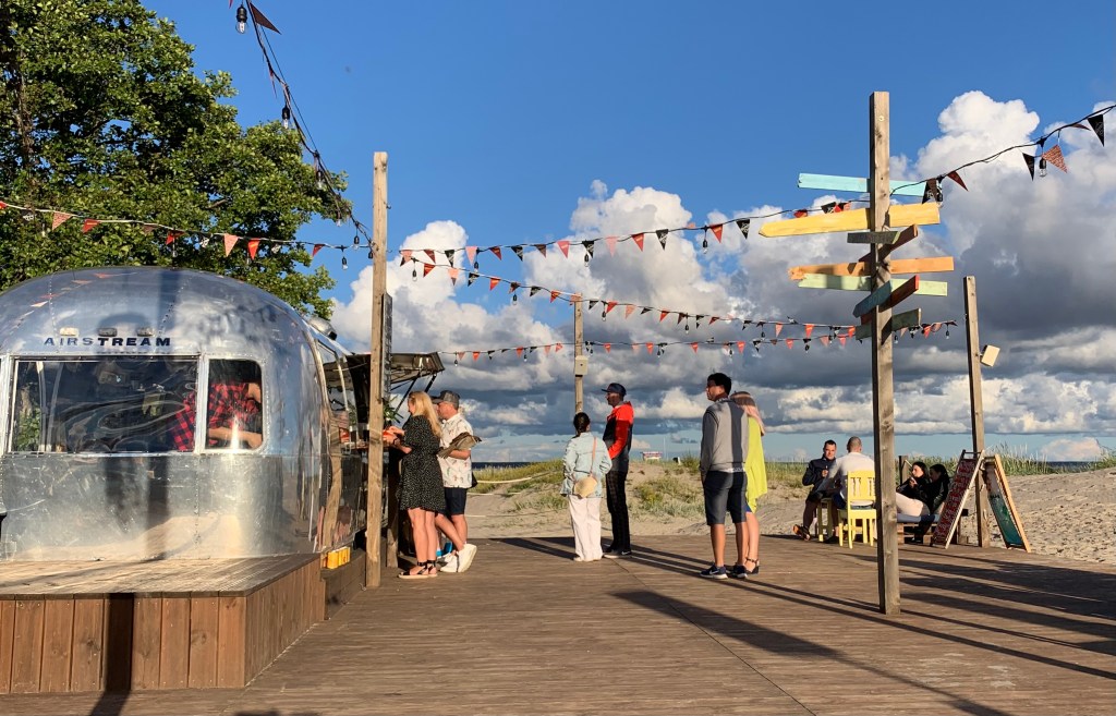 We continued through the park to the beach, which was largely deserted, where a chilly breeze whipped up from the bay. The beachfront seemed primed for summer fun, all it was missing was warmer weather. We walked along the beach to a cocktail bar nestled among the sand dunes – ¿Qué pasa? – where a gleaming Airstream trailer served as the bar and several tables dotted the platform constructed around it. Patrons could also use the complimentary beach chairs to lounge in the dunes with a view of the sea. When we arrived, the atmosphere was lively with a DJ set up in the corner pumping out a steady stream of feel-good tunes and a constant stream of people coming to check out the scene. ¿Qué pasa? specializes in traditional rum cocktails like pina coladas, mojitos, Cuba libres, and daiquiris. With the exception of the Cuba libre, all can have fruit added as an extra ingredient with watermelon, kiwi, and passionfruit among the options. Zach ordered a beer – which is not what you do at ¿Qué pasa? – while I ordered a mojito. Even though it was chilly, it was the perfect welcome to Pärnu.